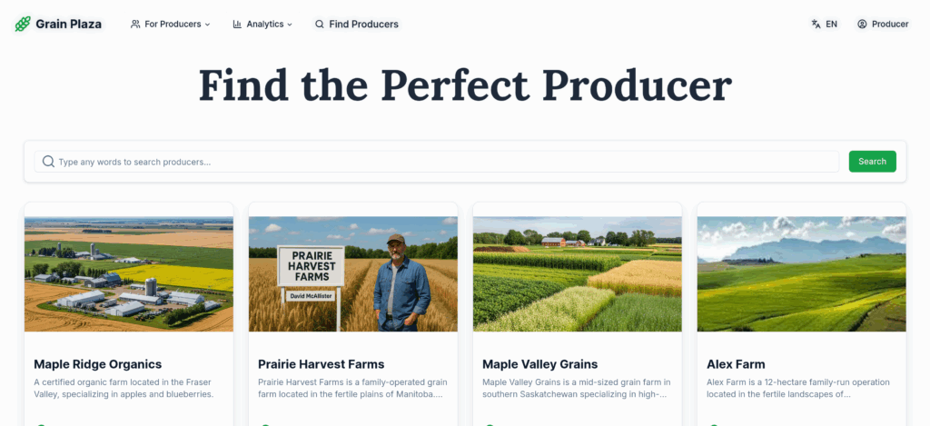 GPSim provides a quick, low-cost way to explore the practicalities of a GrainPlaza-style marketplace. It won’t be complete or totally functional, but it will be fast, affordable, and informative. GPSim combines AI-generated content with curated public materials to create a synthetic mockup of what a production grain-trading system might look like. Its main elements are: